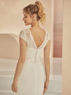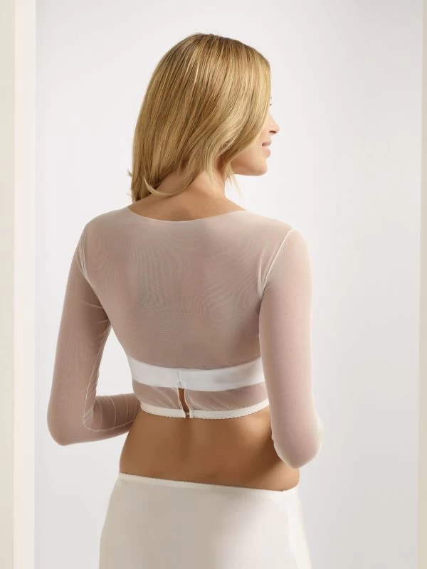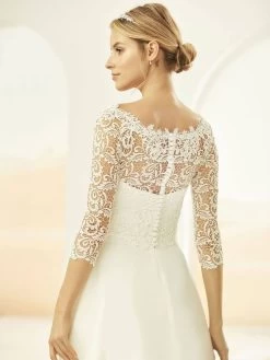 Prachtige bolero gemaakt van delicaat kant. Met korte mouwen en elegante knopen om de achterkant te sluiten.